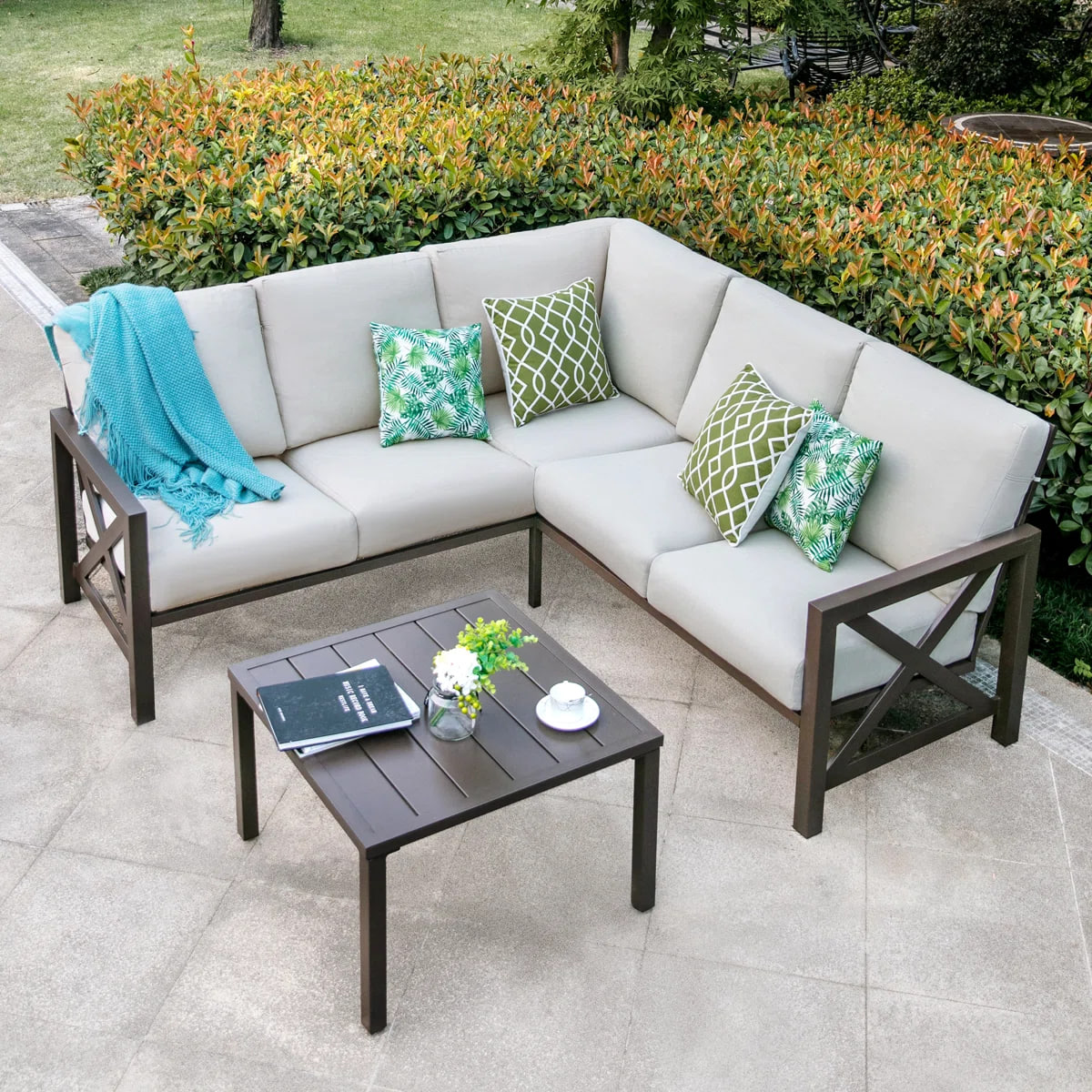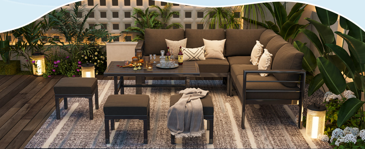 مبلمان فضای باز الشکل با میز – فریم قهوهای و کوسن روشن۴۸٬۰۰۰٬۰۰۰ تومان