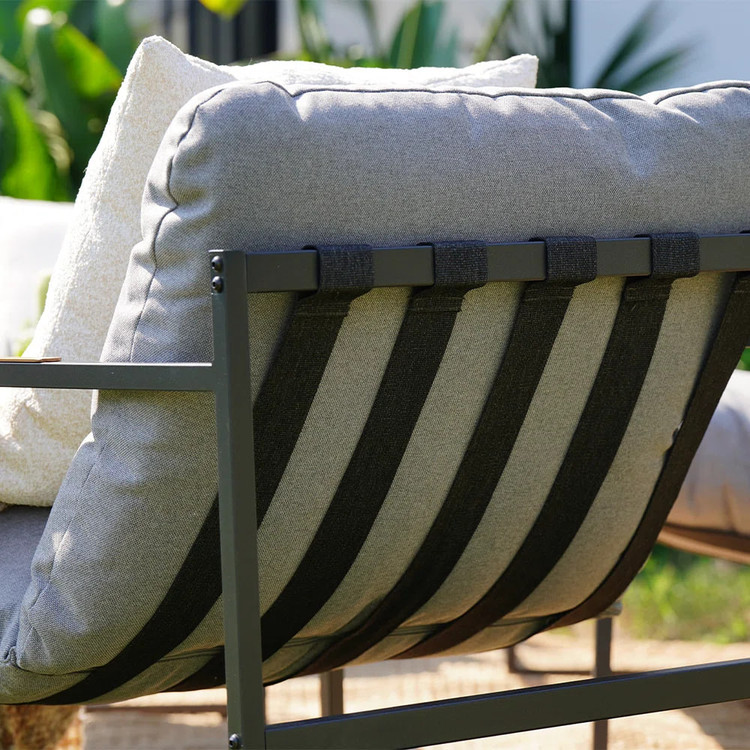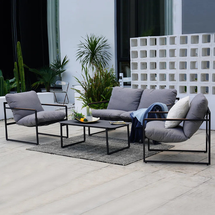 ست مبلمان فضای باز ۴ تکه با طراحی مدرن و جمعوجور، انتخابی ایدهآل برای تراس، حیاط، بالکن بزرگ و روفگاردن است. اسکلت فلزی مشکی، استحکام و پایداری بالایی ایجاد میکند و نوار طرحچوب روی دستهها حس گرما و طبیعیبودن را به چیدمان شما میافزاید. کوسنهای ضخیم (حدود ۷ اینچ) نشیمن نرم و راحتی فراهم میکنند و عمق ۲۵ اینچی نشیمن باعث میشود هنگام استراحت، بدن بهخوبی حمایت شود. میز مستطیلی کمارتفاع هم برای قرار دادن پذیرایی، کتاب و گجتها کاملاً کاربردی است.